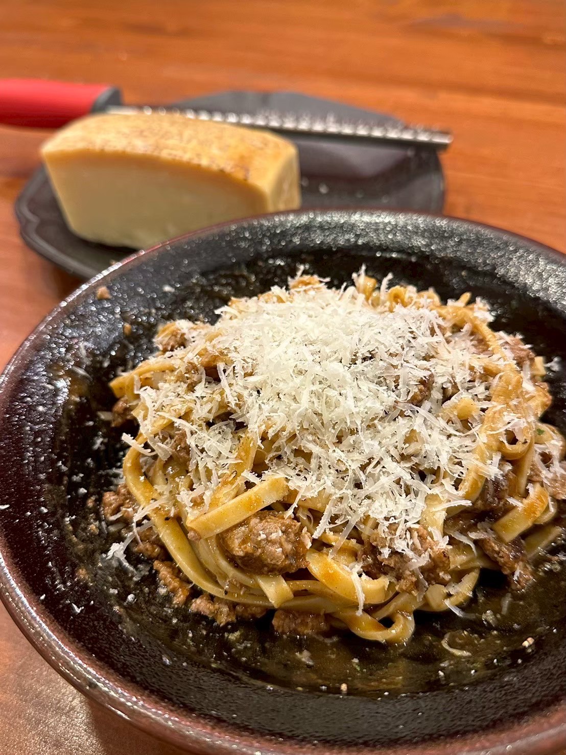 自家製ピクルス、モッツァレラチーズたっぷりのボロネーゼ、自家製フォカッチャ、パンナコッタをオーダー。パスタはモチモチ系。アルデンテが流行ってるけど、モチモチのパスタだって美味しいんだと再確認させてもらえましたね。